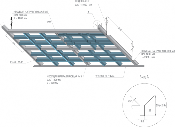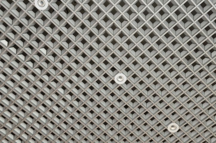 Пирамидальный грильято представляет собой решетку созданную из U-профилей особой конструкции, где кромка профиля выгнута на 45 градусов. Такое решение позволяет еще больше скрыть запотолочное пространство. Визуально это выглядит так: