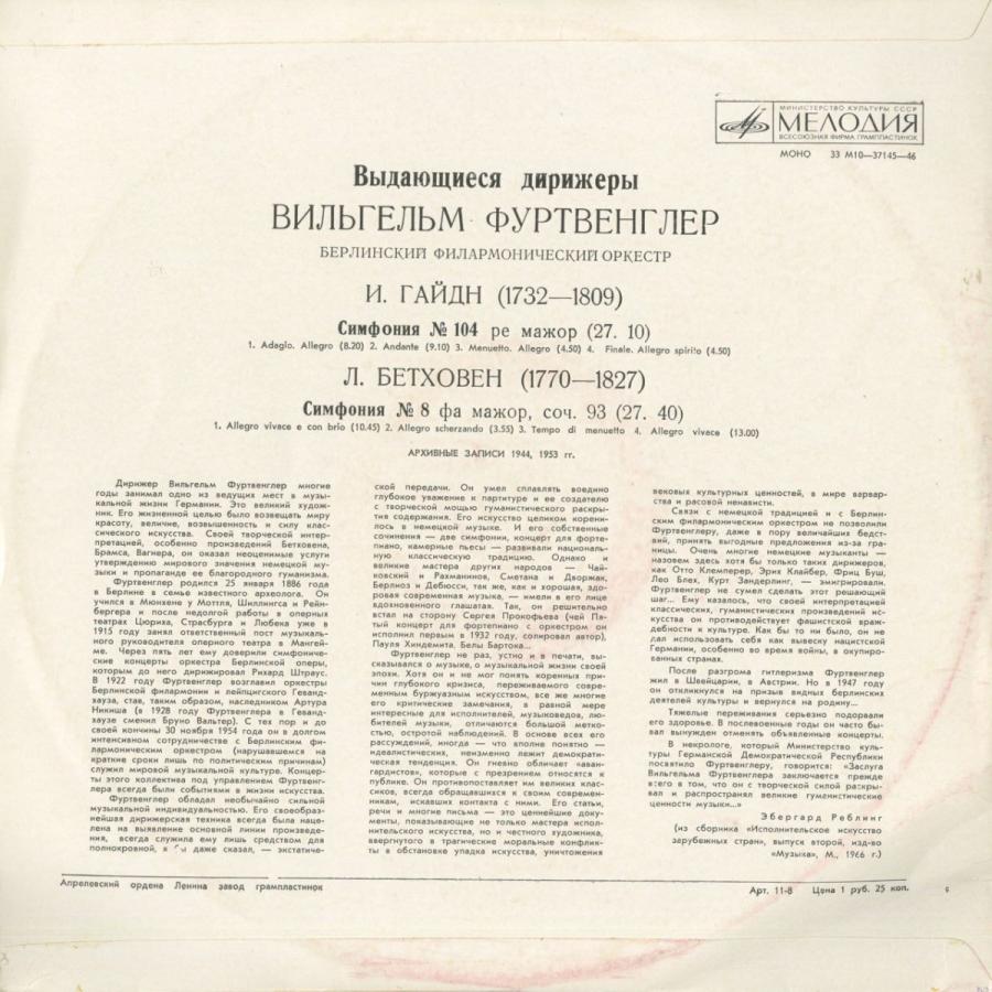 商品情報ベートーヴェン:交響曲8番Op.93,ハイドン:交響曲104番/W.フルトヴェングラー指揮ベルリンpo./露MELODIYA:M10 37145 |